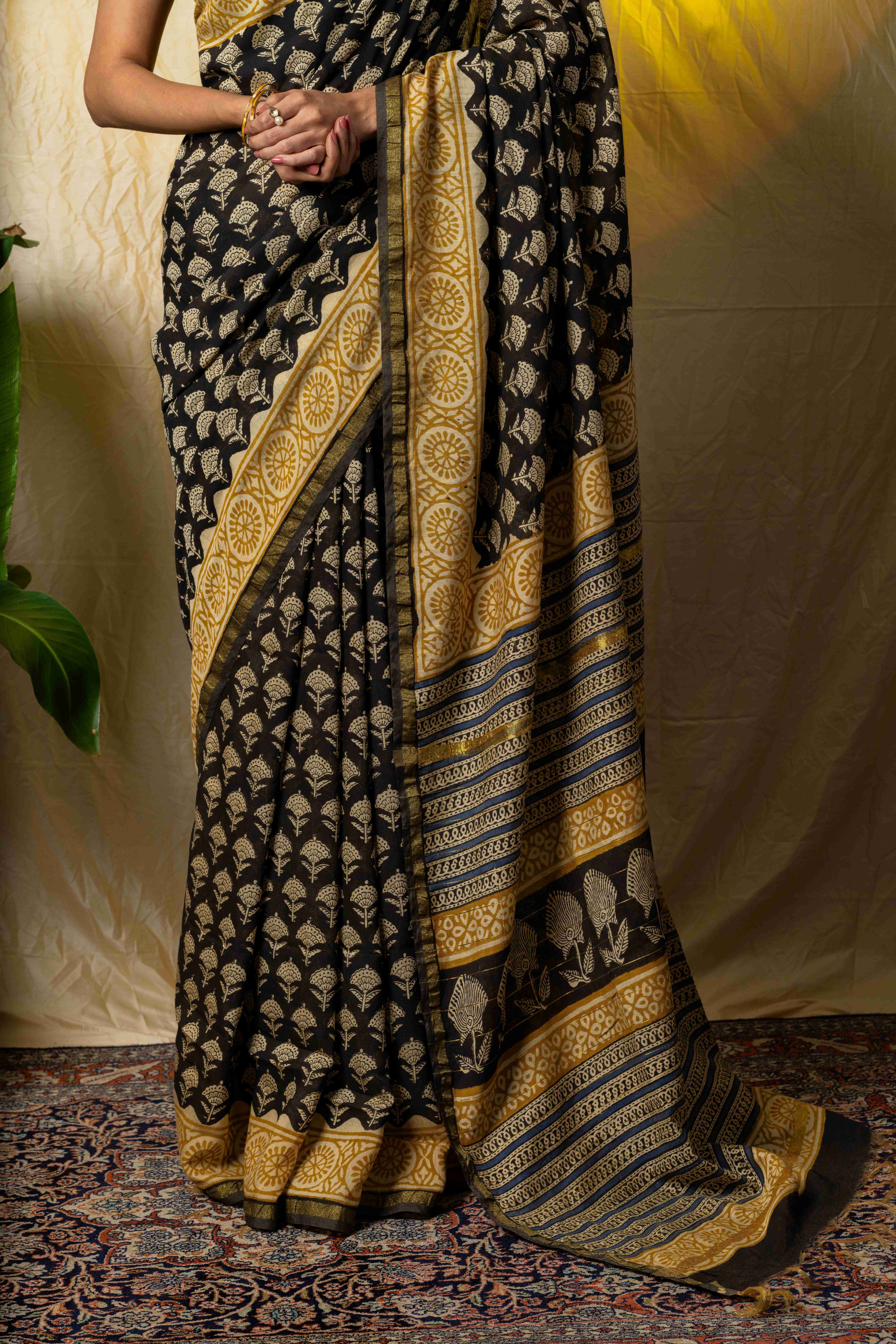 The Traditonal BLack Chanderi Silk Saree is crafted from the finest quality Silk & Merccerised Cotton with a intricate border. Shocasing the rich textile herritage of Chanderi, Madhya Pradesh. The exquisite saree is skillfully, Handwoven using traditonal Chanderi weaving techniques by master artisan shocasing The Artisans Precision & Experties. This Chanderi Silk Saree offers unparalleled comfort due to its Lightweight & Breathable Fabric . The blend of Silk & Cotton ensure a soft & gentle drape, making it comfortable for all day wear. Slight difference it shade might appear due to camera light.