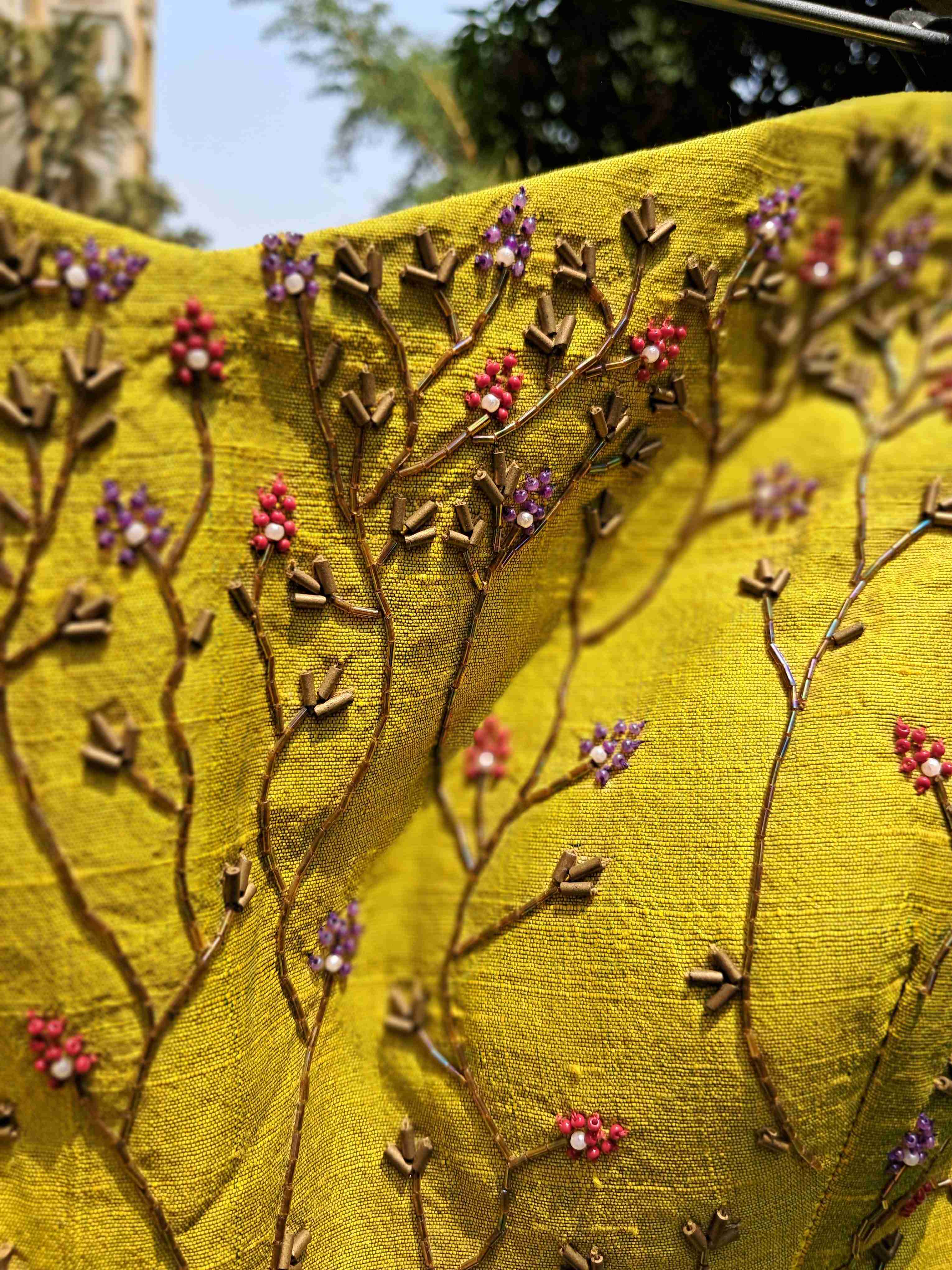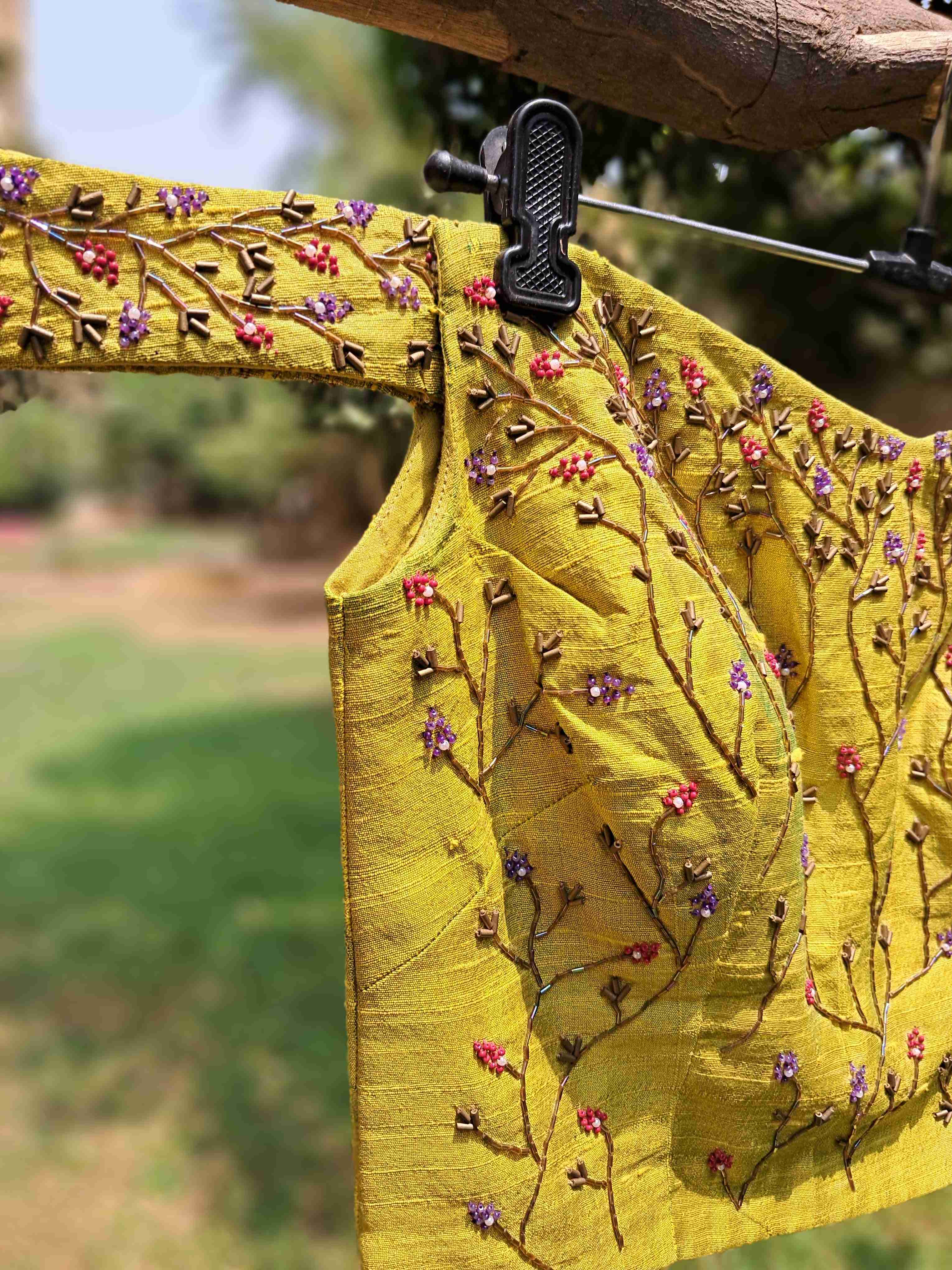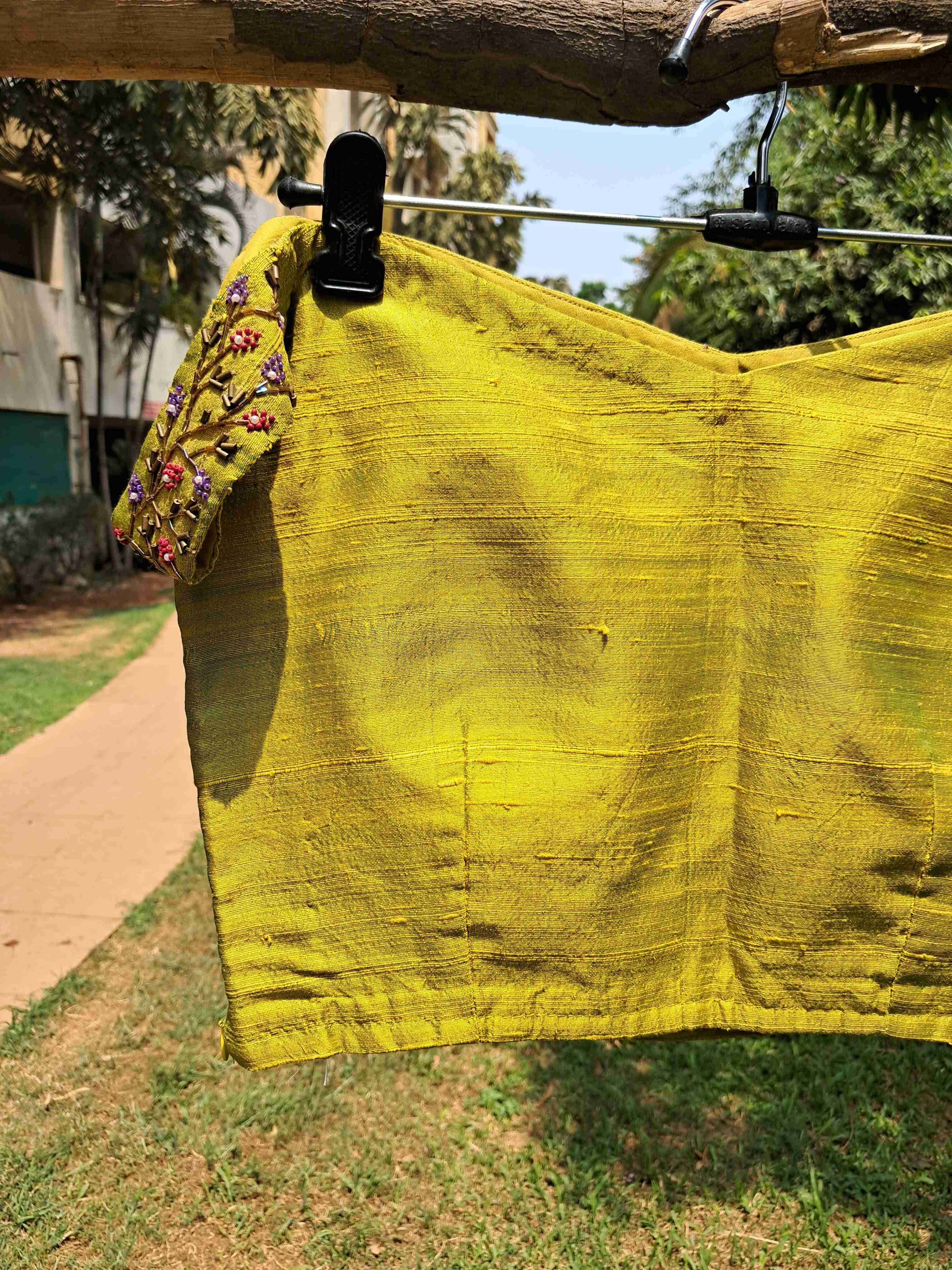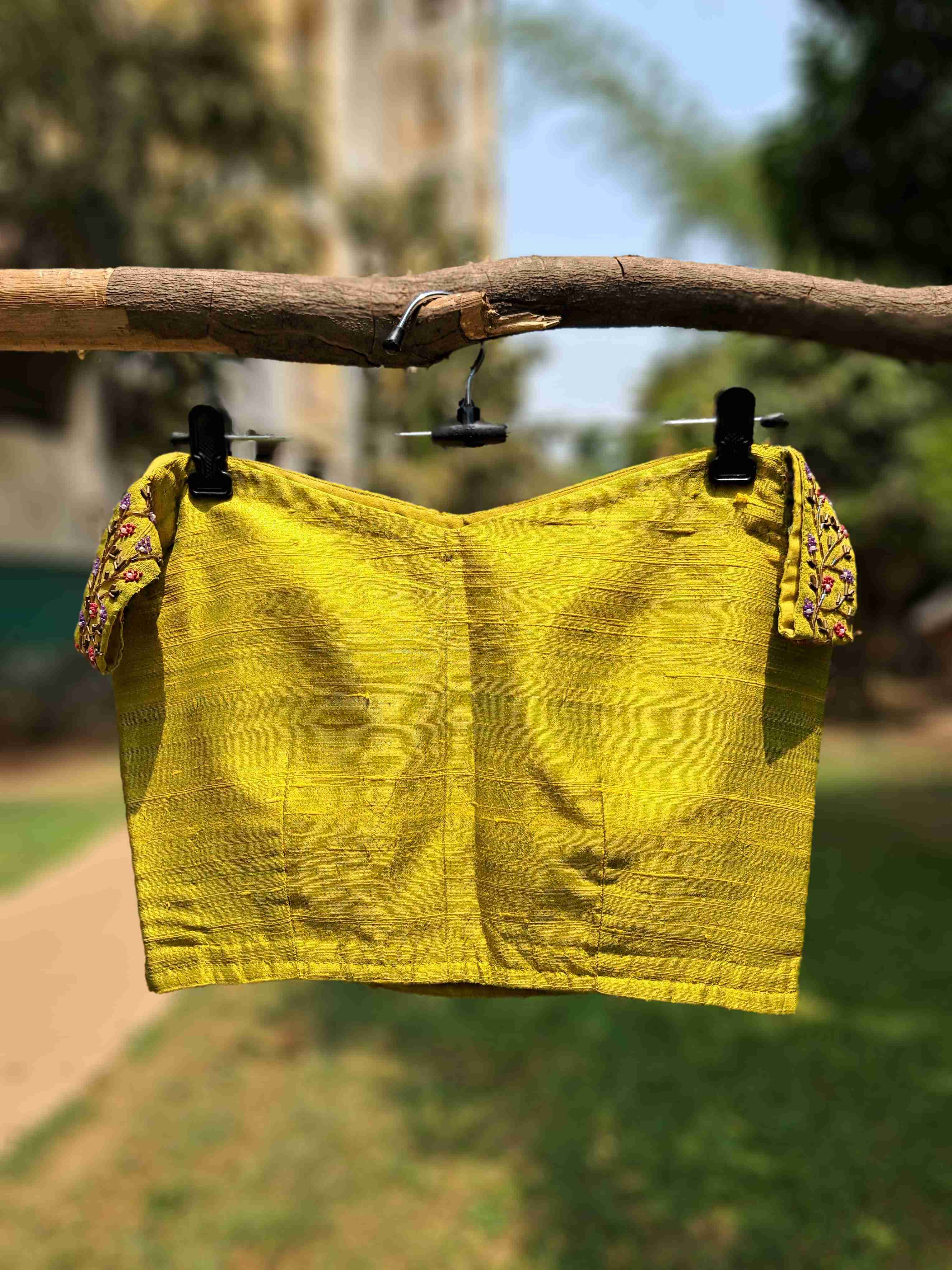 Yellow Raw Silk Blouse With Hand Embroidery.