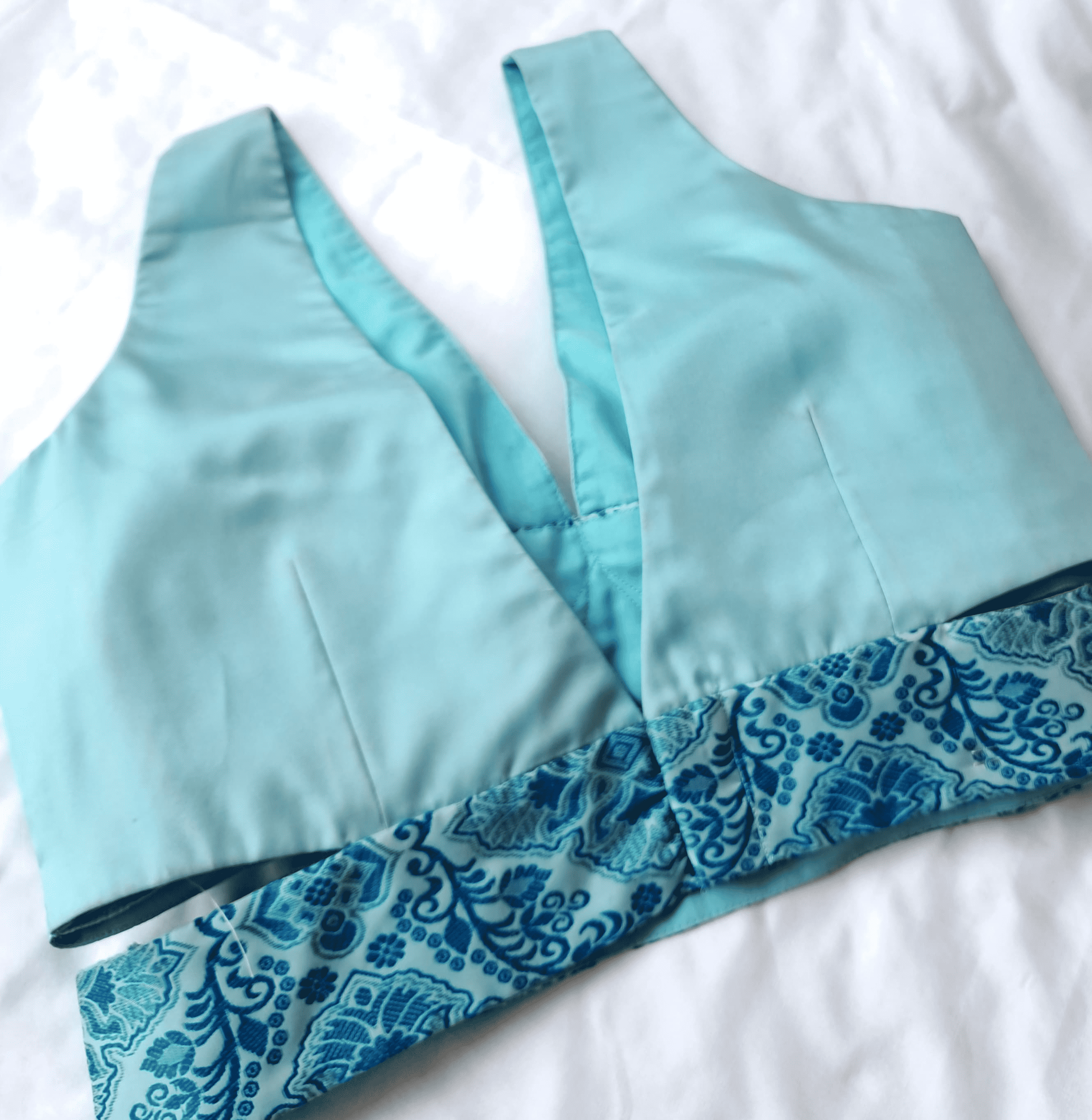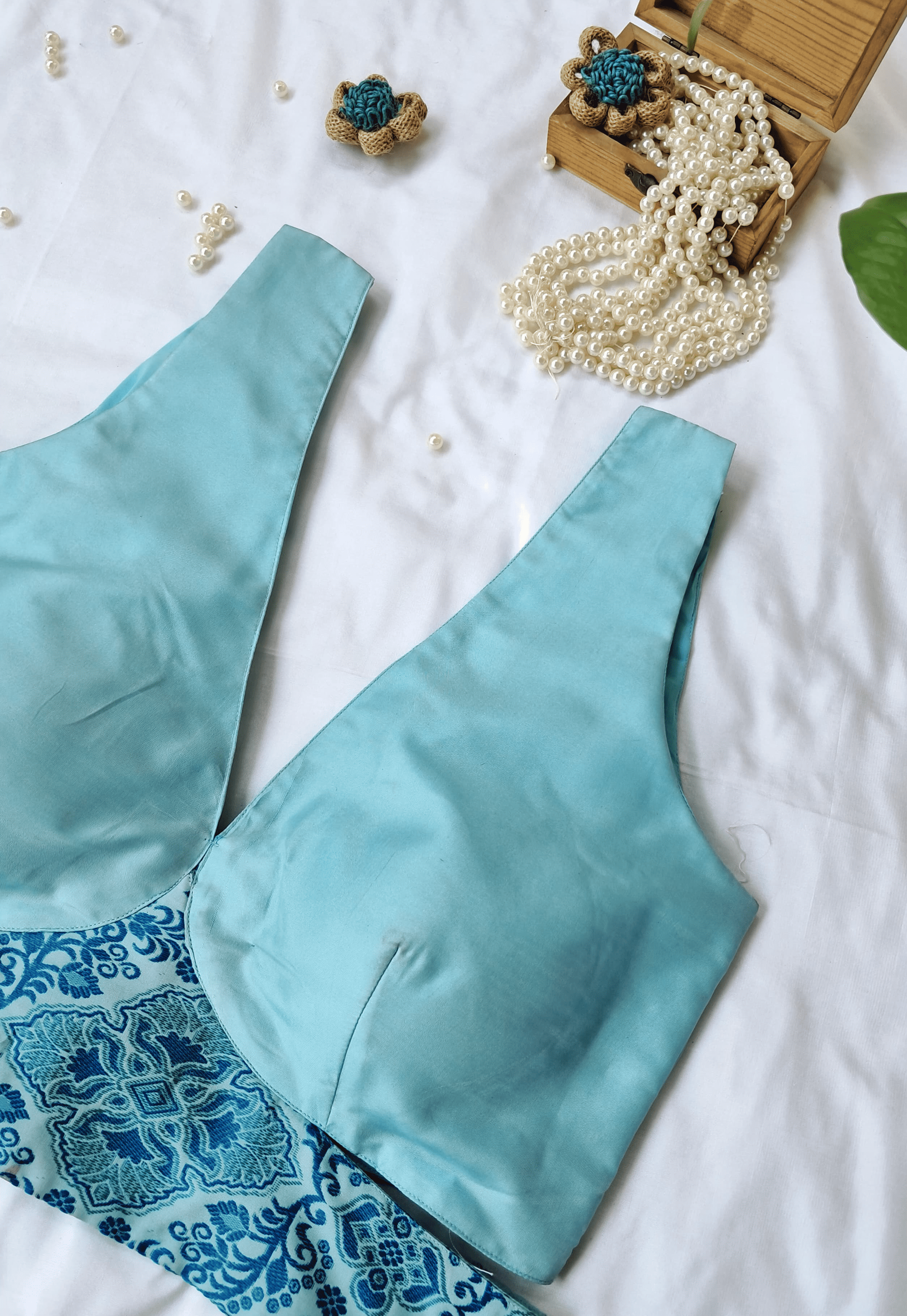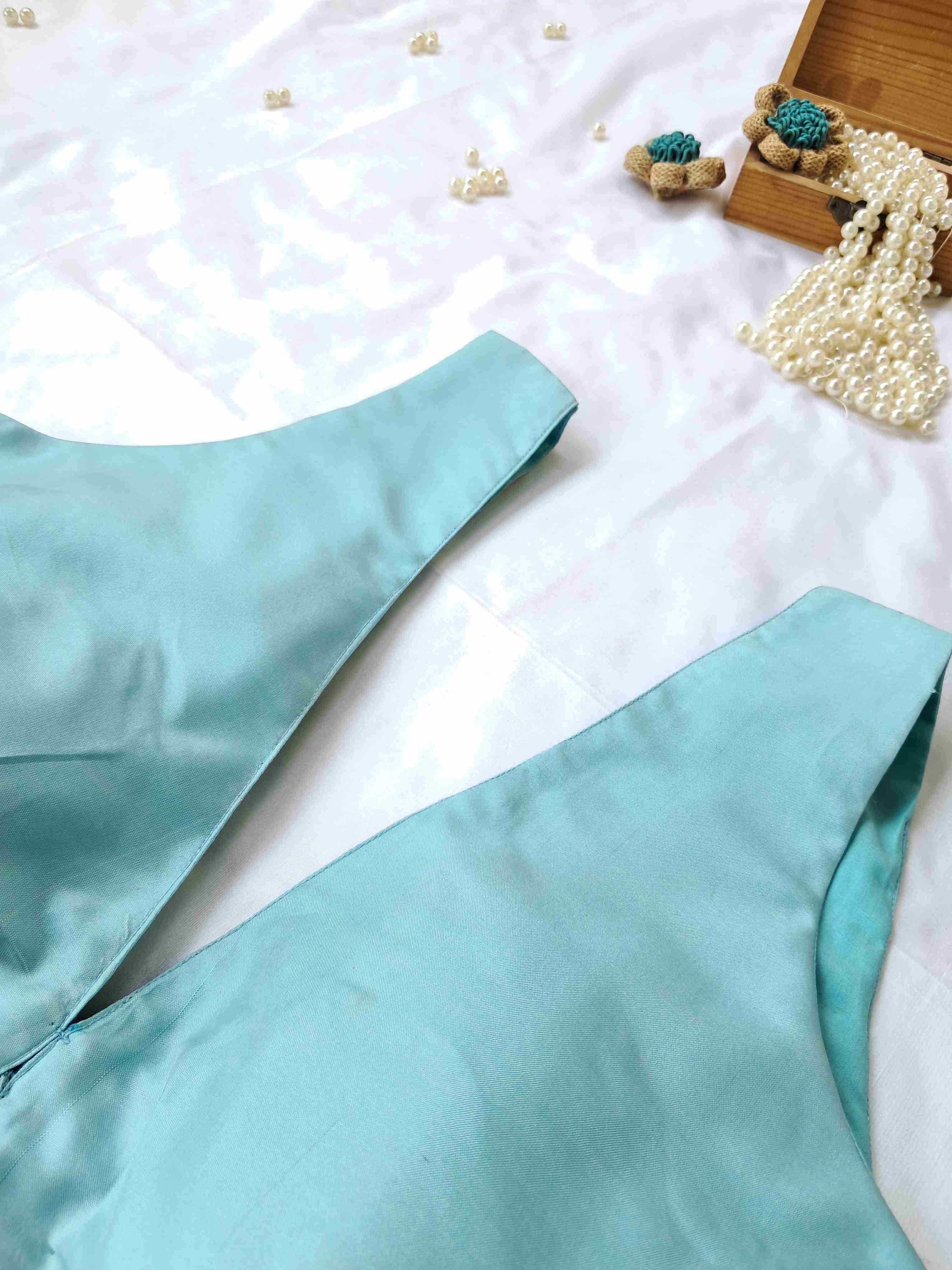 Blue Silk Fancy Blouse With Artistic Cuts At The Yoke . Padded Blouse With Cotton Linning. Slight Difference In shade Might Appear Due To Camera Light.