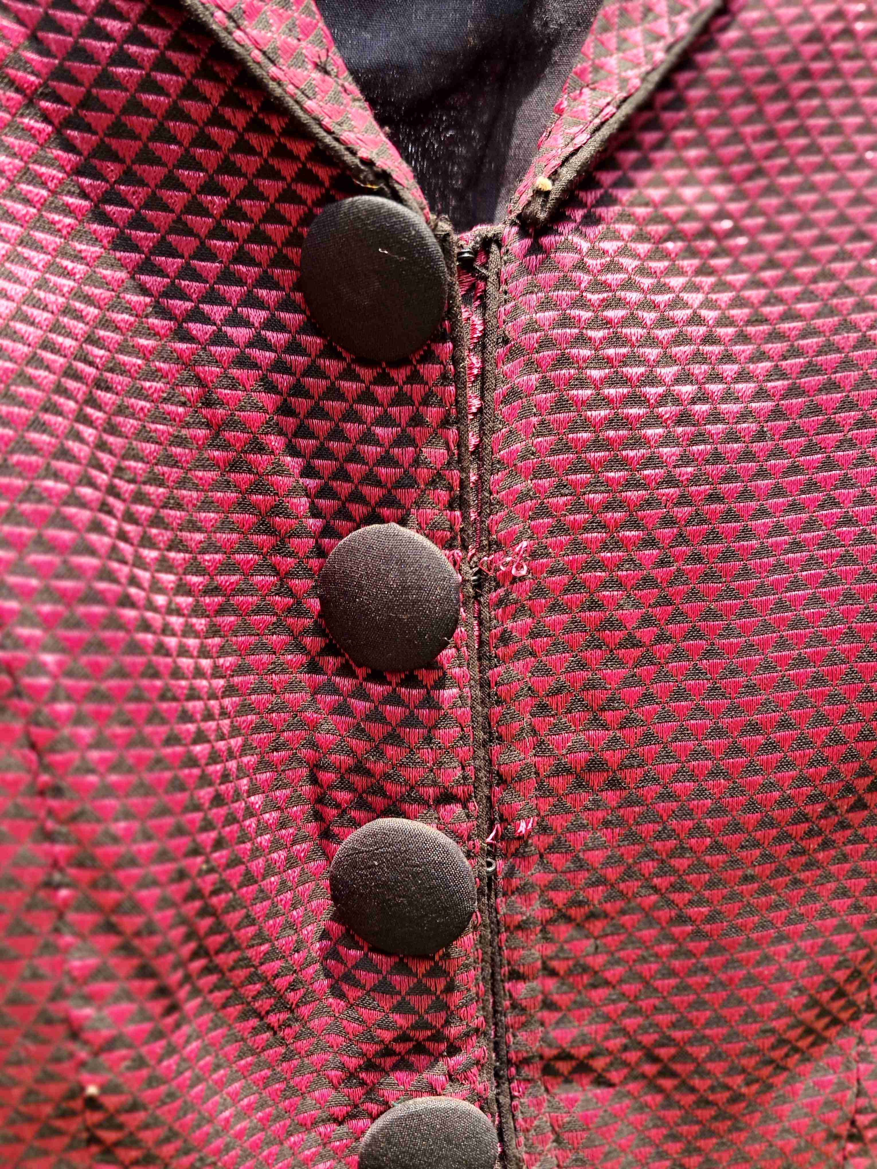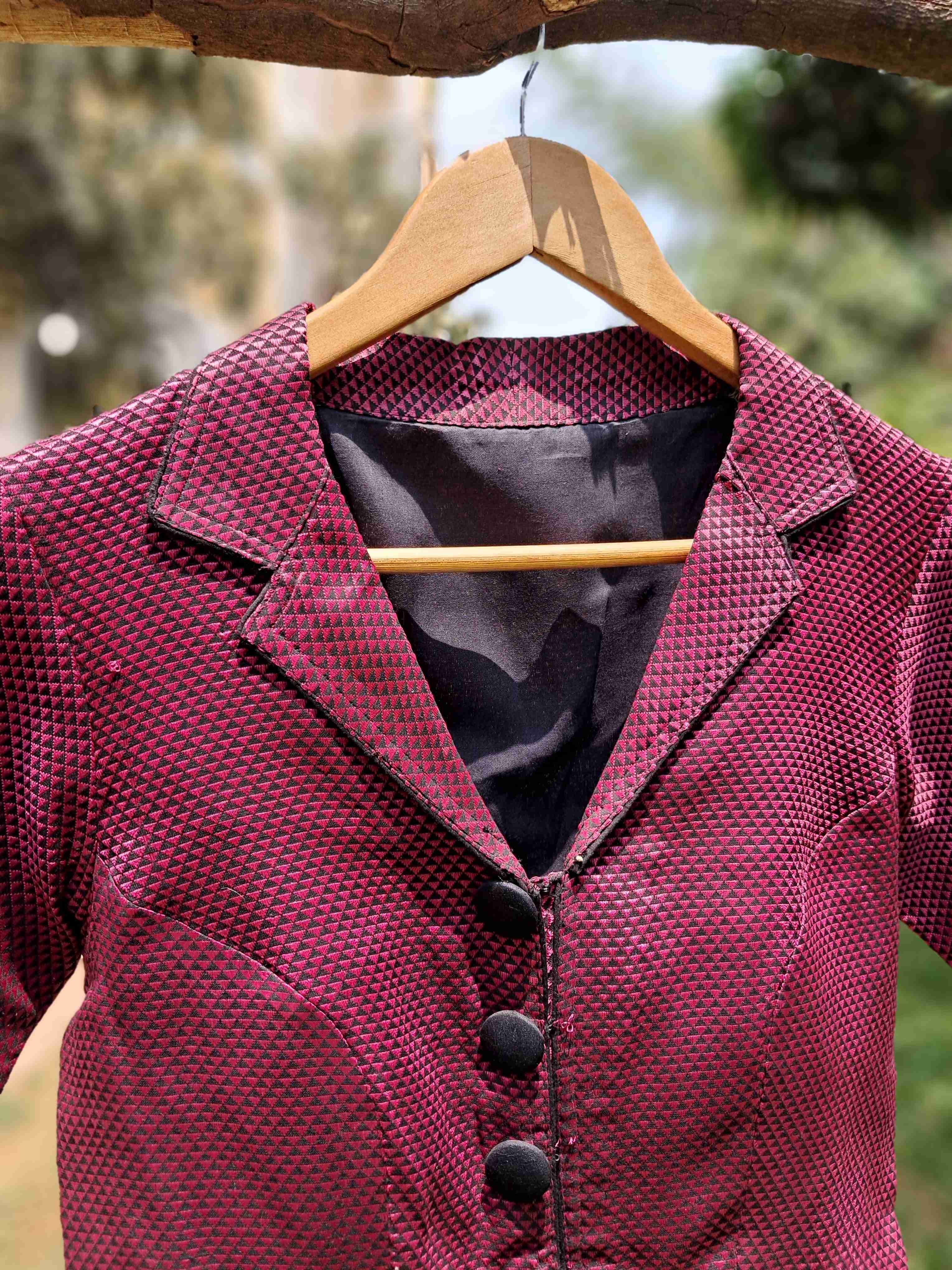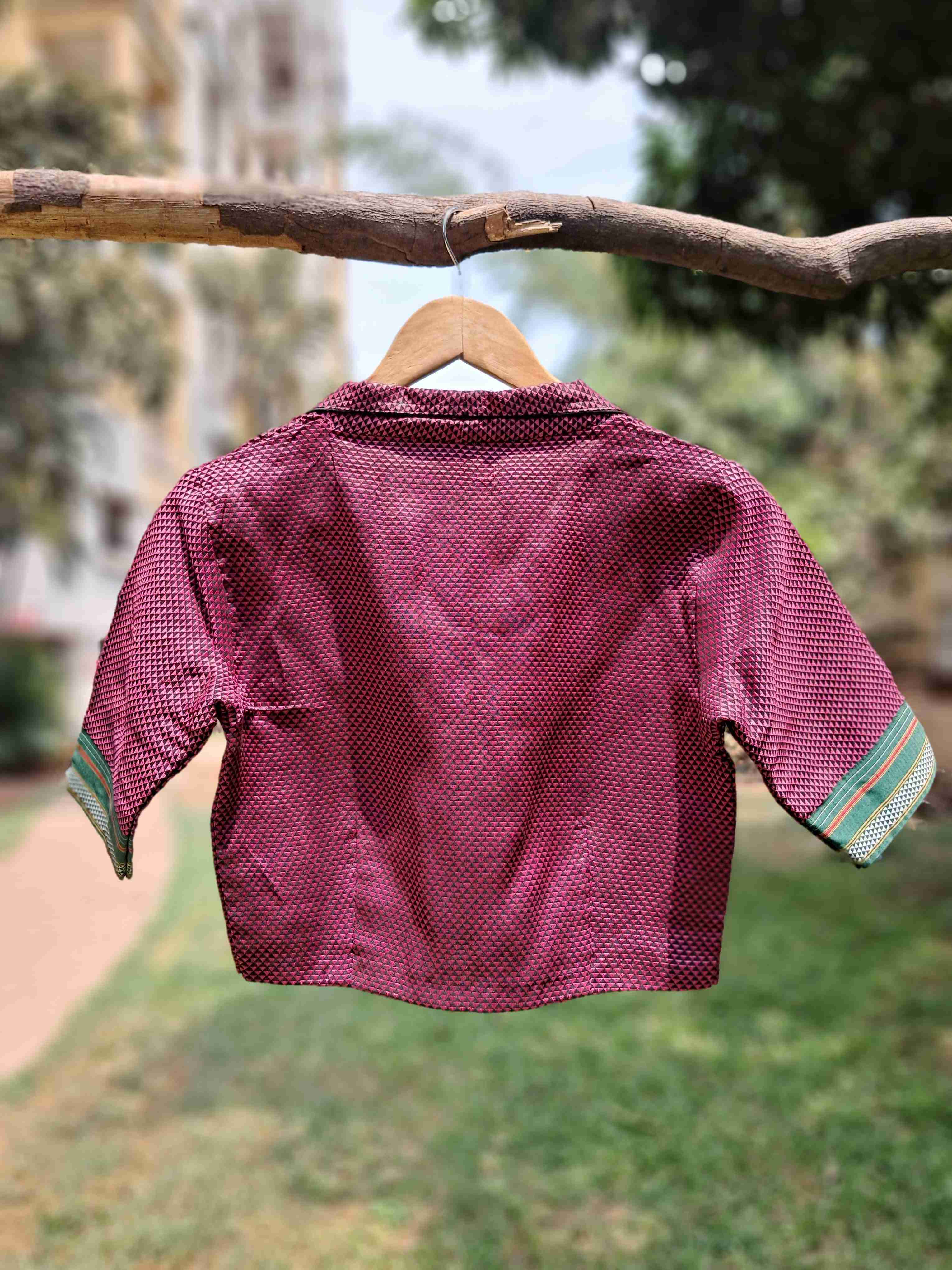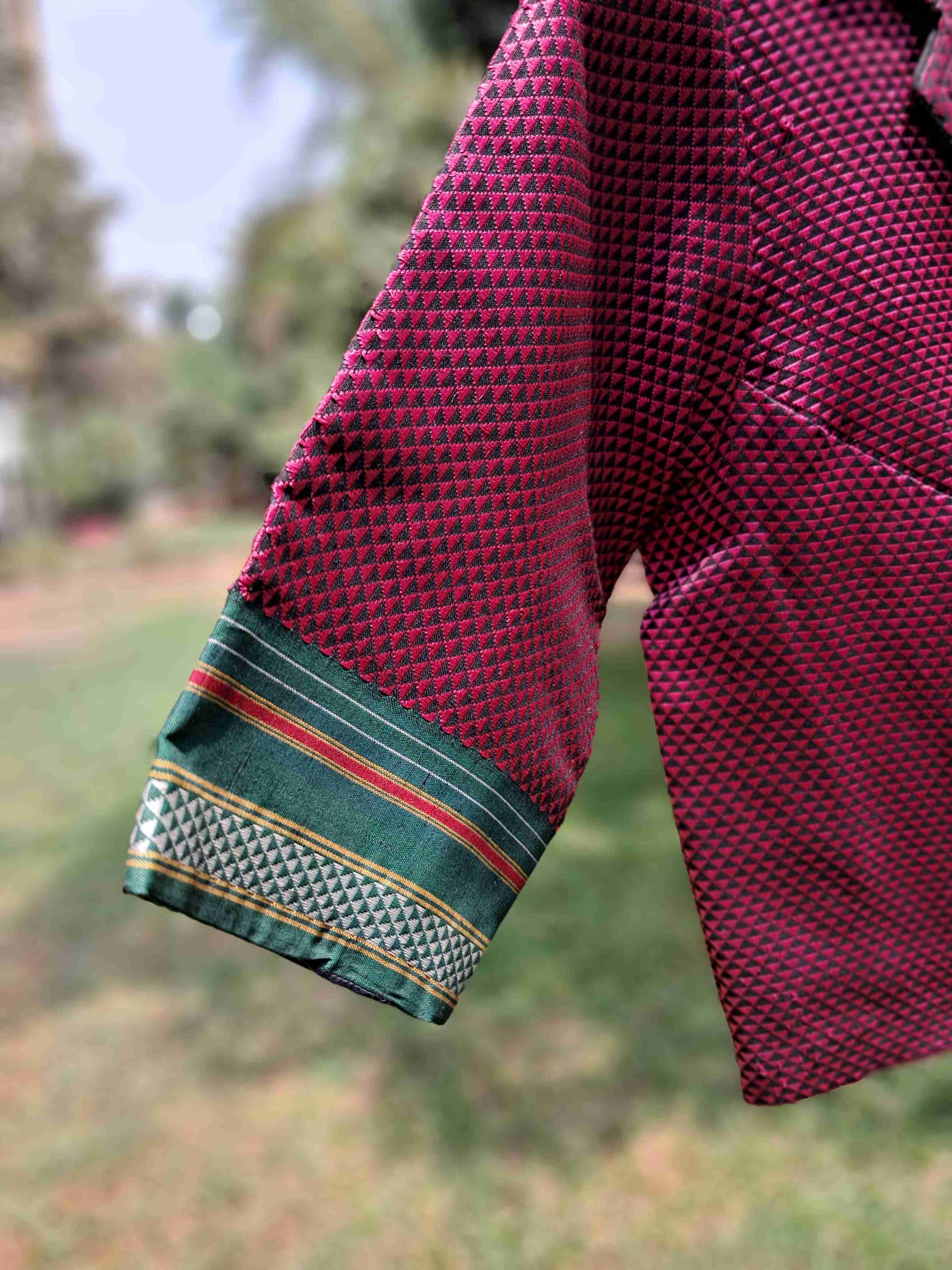 Pink Khun Blouse With Notch Collar , Hook Opening At Front Also Embellished With Black Fabric Butttons . Non Padded With Cotton Linning. Contrast Green Border On Sleeve. Slight Difference In shade Might Appear Due To Camera Light.