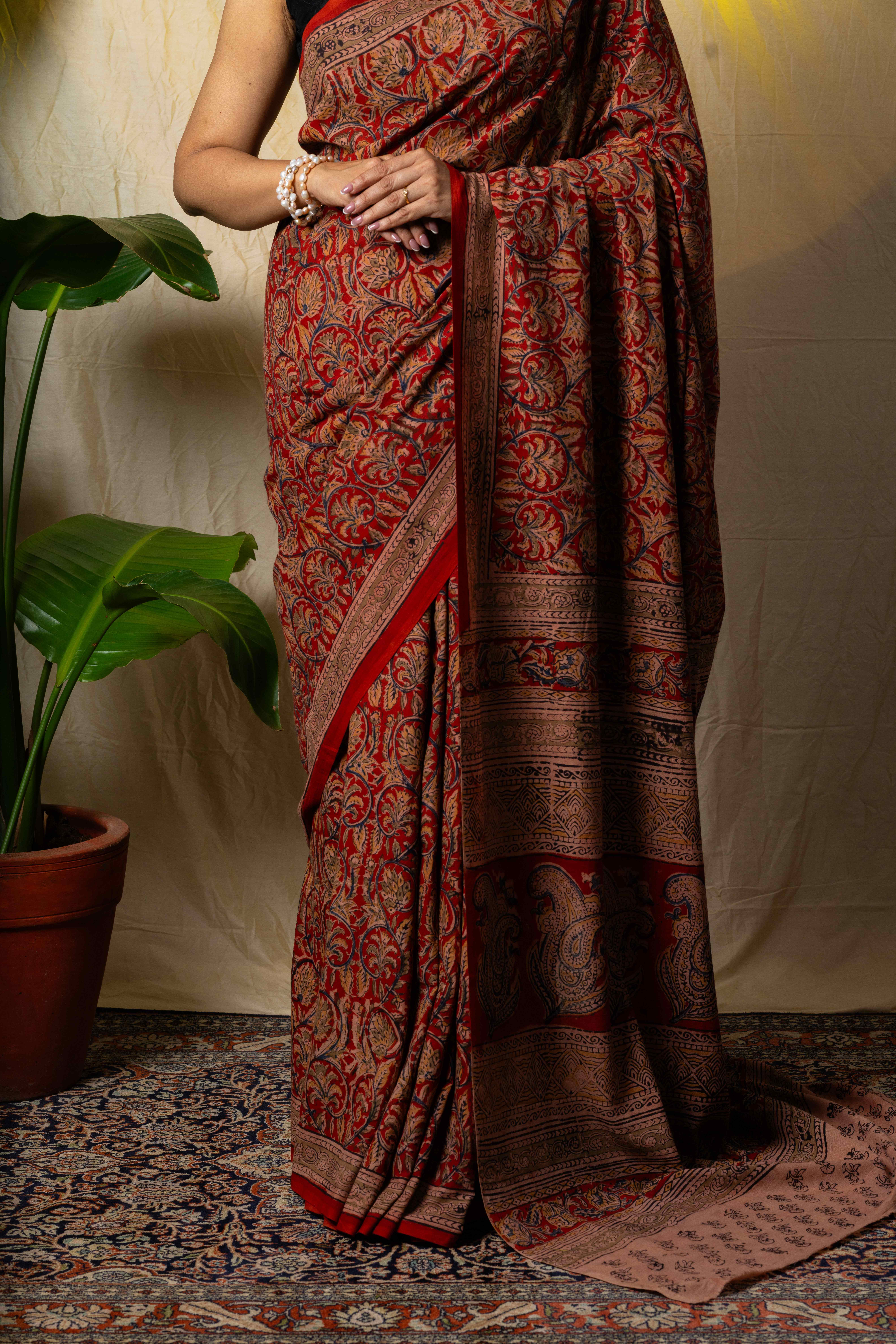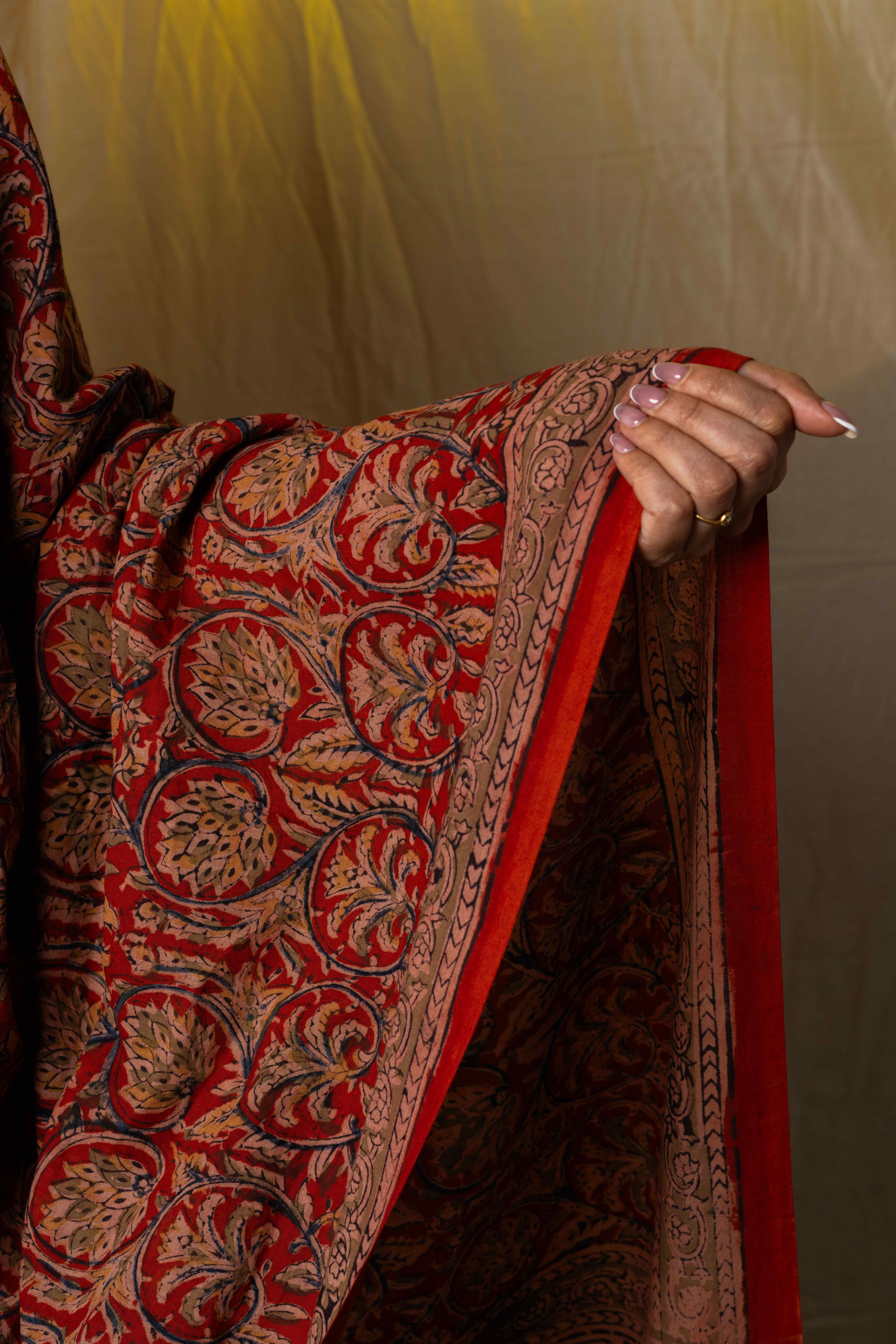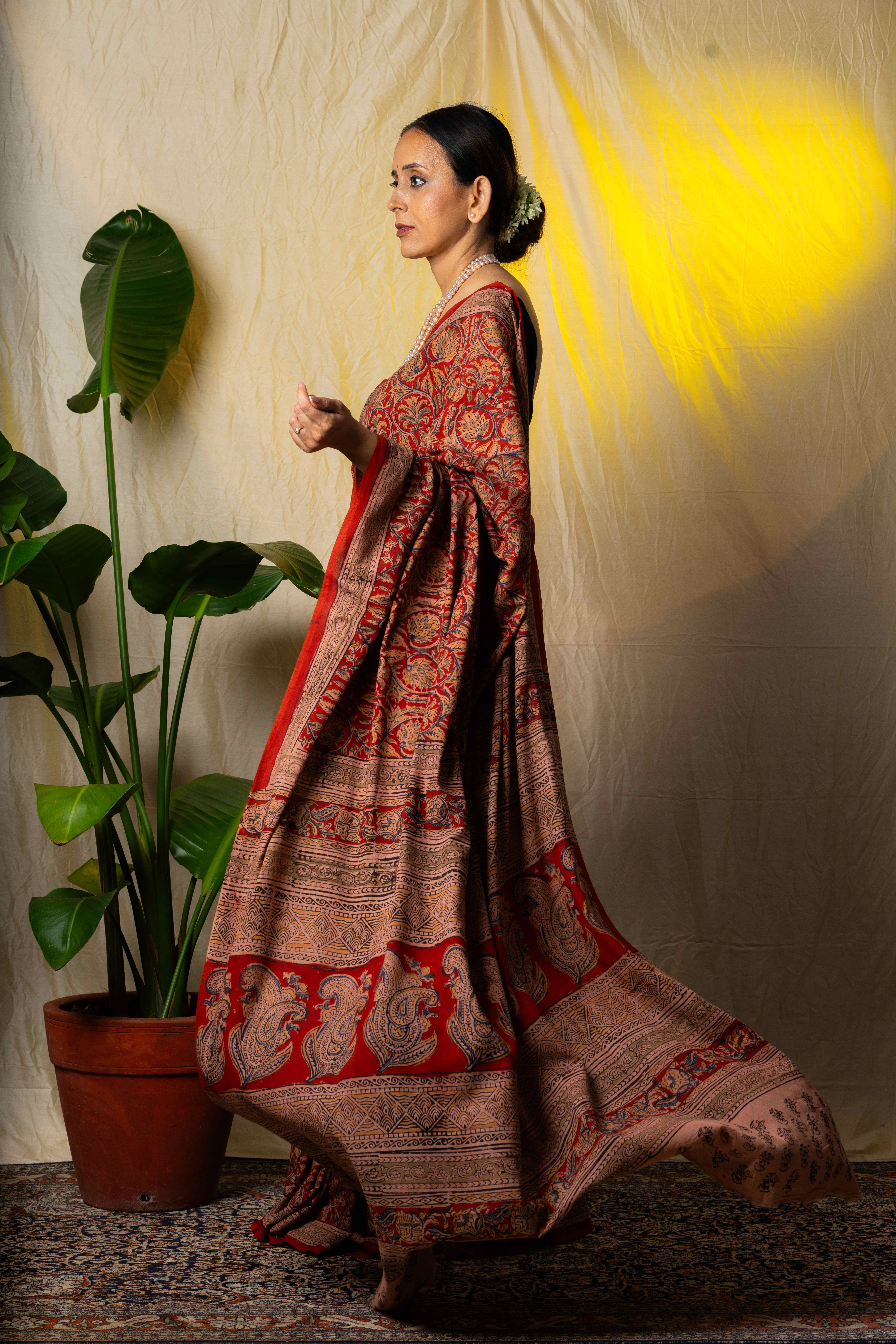 Finest pure cotton threads are woven together to bring this red cotoon saree bringing timeless grace and unparalleled comfort. A saree perfect for any day, you can wear it for your daily comfort.This exquisite saree is skillfully printed using traditonal method of kalamkari block printingby skilled Artisan. it has intricate printed border, showcasing the Artisans Precision and Expertise. Slight difference in shade might appear due to camera light. One of the most widespread techniques used for fabric decoration, handblock printing has been practiced by extremely skillful artisans for centuries to India. This remarcable traditonal craft of fabric printing involves the use of enqraved wooden blocks , with seperate box with seperate blocks for each colour pressed against fabric with great precision to create striking patterns. Examples of this very fine block printing go back centuries.