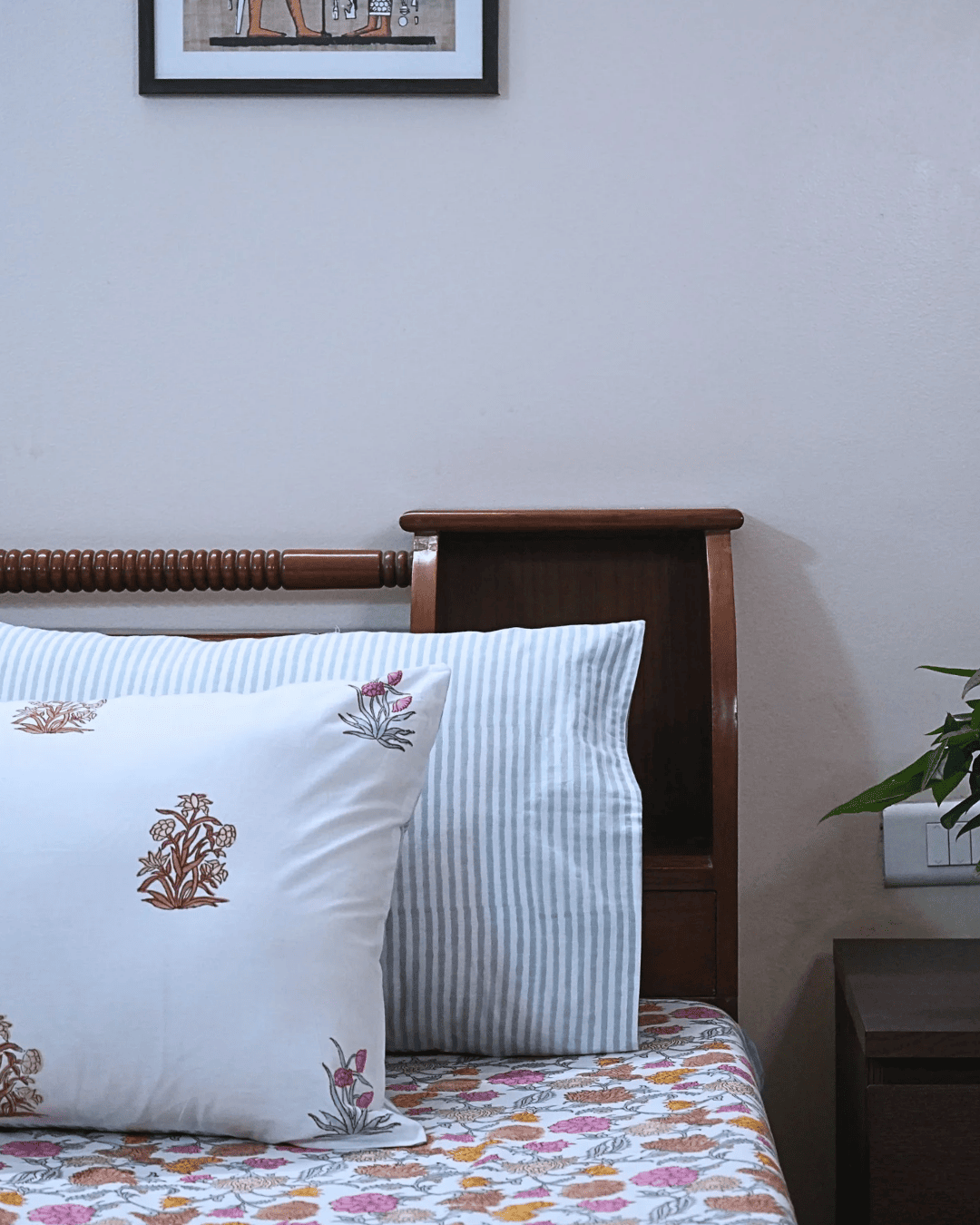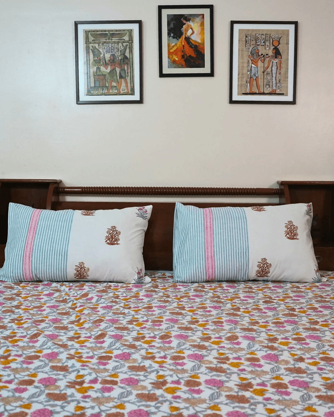 Handblock Printed Queen Size Bed Cover With 2 Pillow Covers. Add a touch of timeless elegance to your bedroom wih this handcrafted bed cover, made using traditional handblock printing techniques. Crafted from 100% coton and printed with eco-frindly dyes, it's soft, breathable, and beautifully unique.