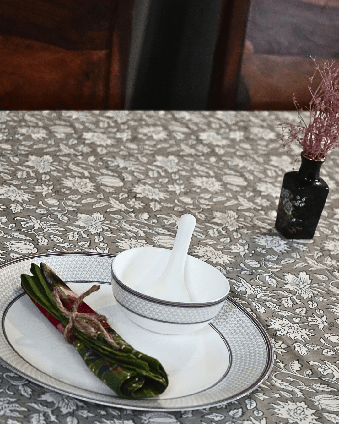 A beautifully handcrafted table cloth six seater featuring traditional handblock prints. Made from soft, premium cotton, it showcases intricate motifs stamped by skilled artisans. Its vibrant yet elegant design adds a touch of artistry and charm to any dining space. Perfect for daily use or special occasions.