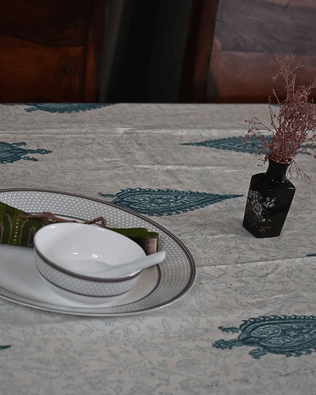 A beautifully handcrafted table cloth six seater featuring traditional handblock prints. Made from soft, premium cotton, it showcases intricate motifs stamped by skilled artisans. Its vibrant yet elegant design adds a touch of artistry and charm to any dining space. Perfect for daily use or special occasions.