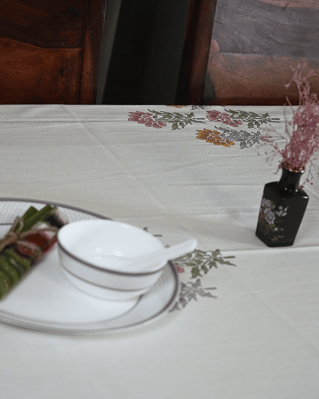 A beautifully handcrafted table cloth six seater featuring traditional handblock prints. Made from soft, premium cotton, it showcases intricate motifs stamped by skilled artisans. Its vibrant yet elegant design adds a touch of artistry and charm to any dining space. Perfect for daily use or special occasions.