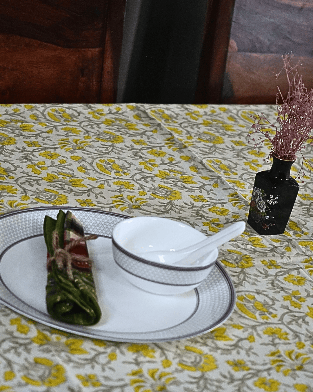A beautifully handcrafted table cloth six seater featuring traditional handblock prints. Made from soft, premium cotton, it showcases intricate motifs stamped by skilled artisans. Its vibrant yet elegant design adds a touch of artistry and charm to any dining space. Perfect for daily use or special occasions.