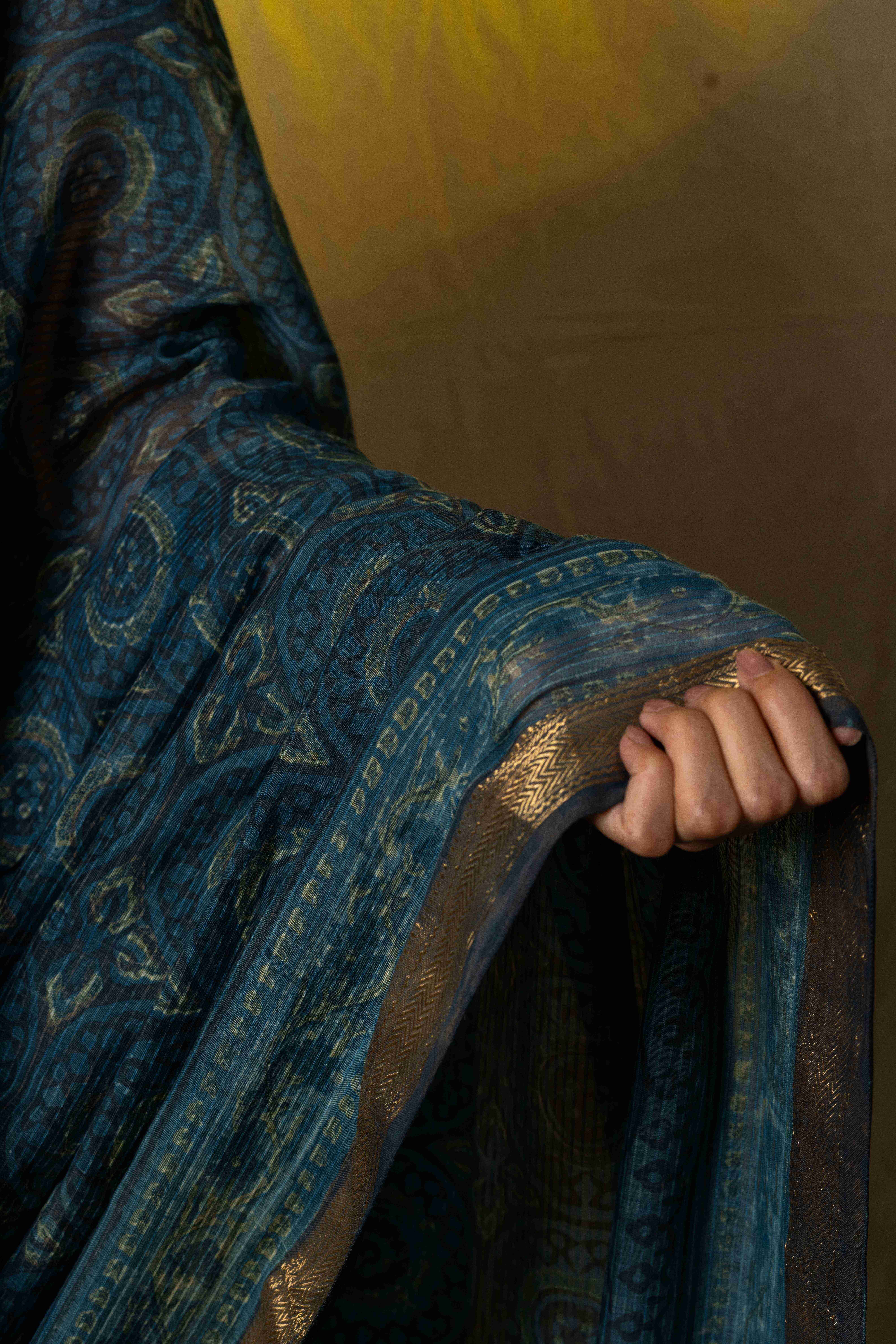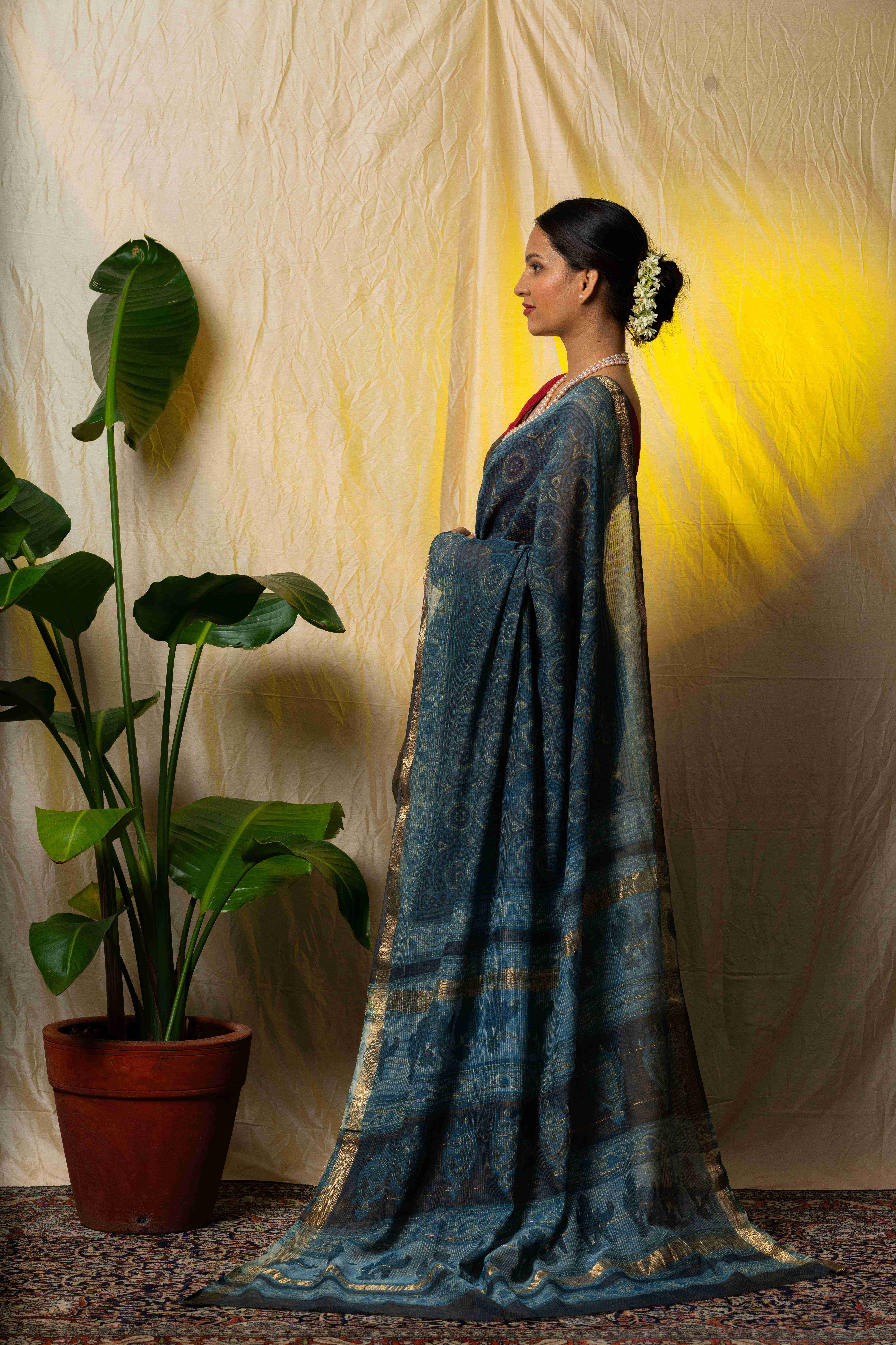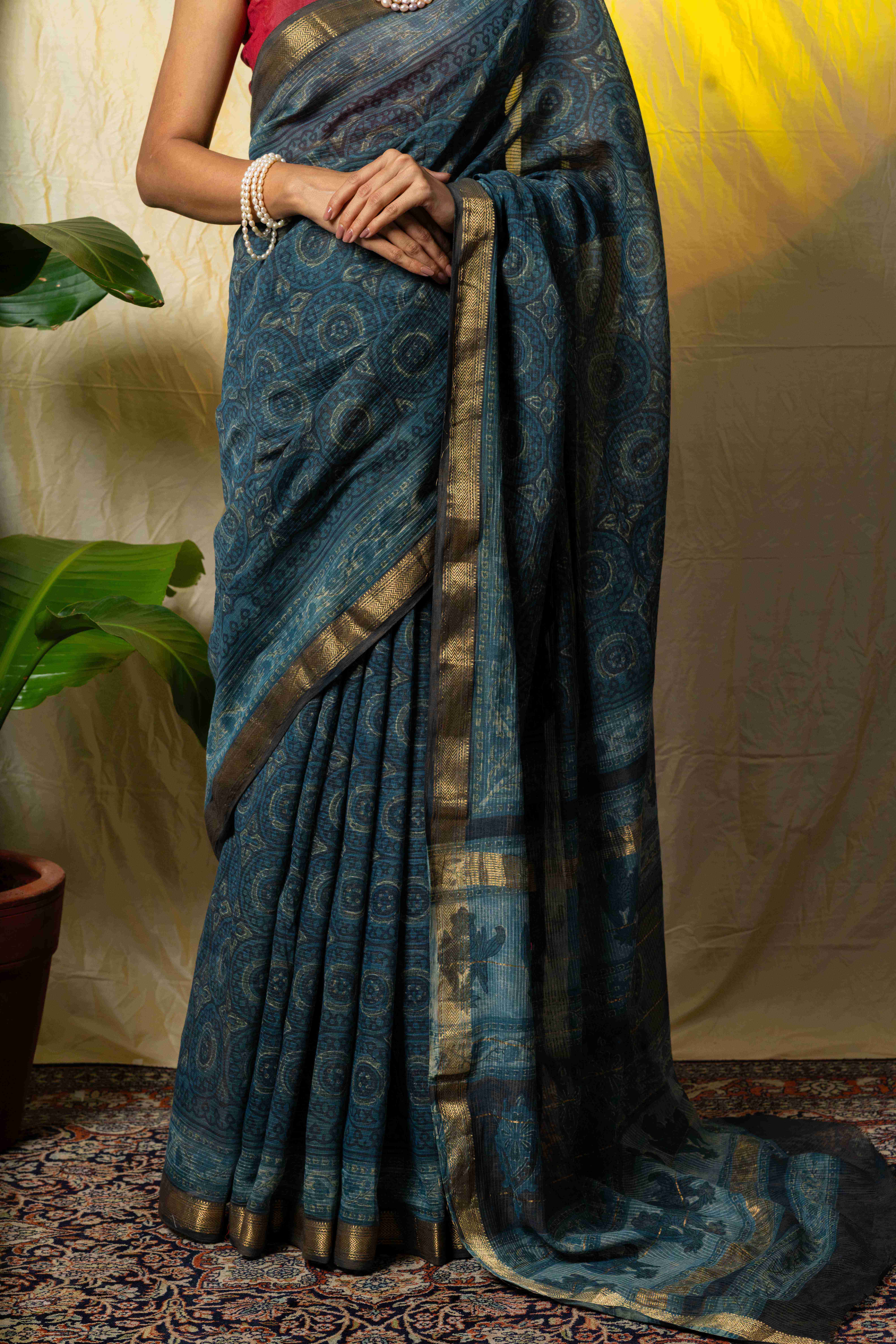 Discover The Timeless Charm Of The Handblock Maheshwari Silk Saree, an exquisite handwoven masterpiece that blends tradition with elegance. Crafted in the historic town of maheshwar,madhya pradesh. The body of the saree is adorded with delicate small buthas(motifs) intricatly woven in jari. Its border is designed with fine jari detaling. The light weght texture and brithable fabric make it perfact for both festive vocation and everyday elegance.