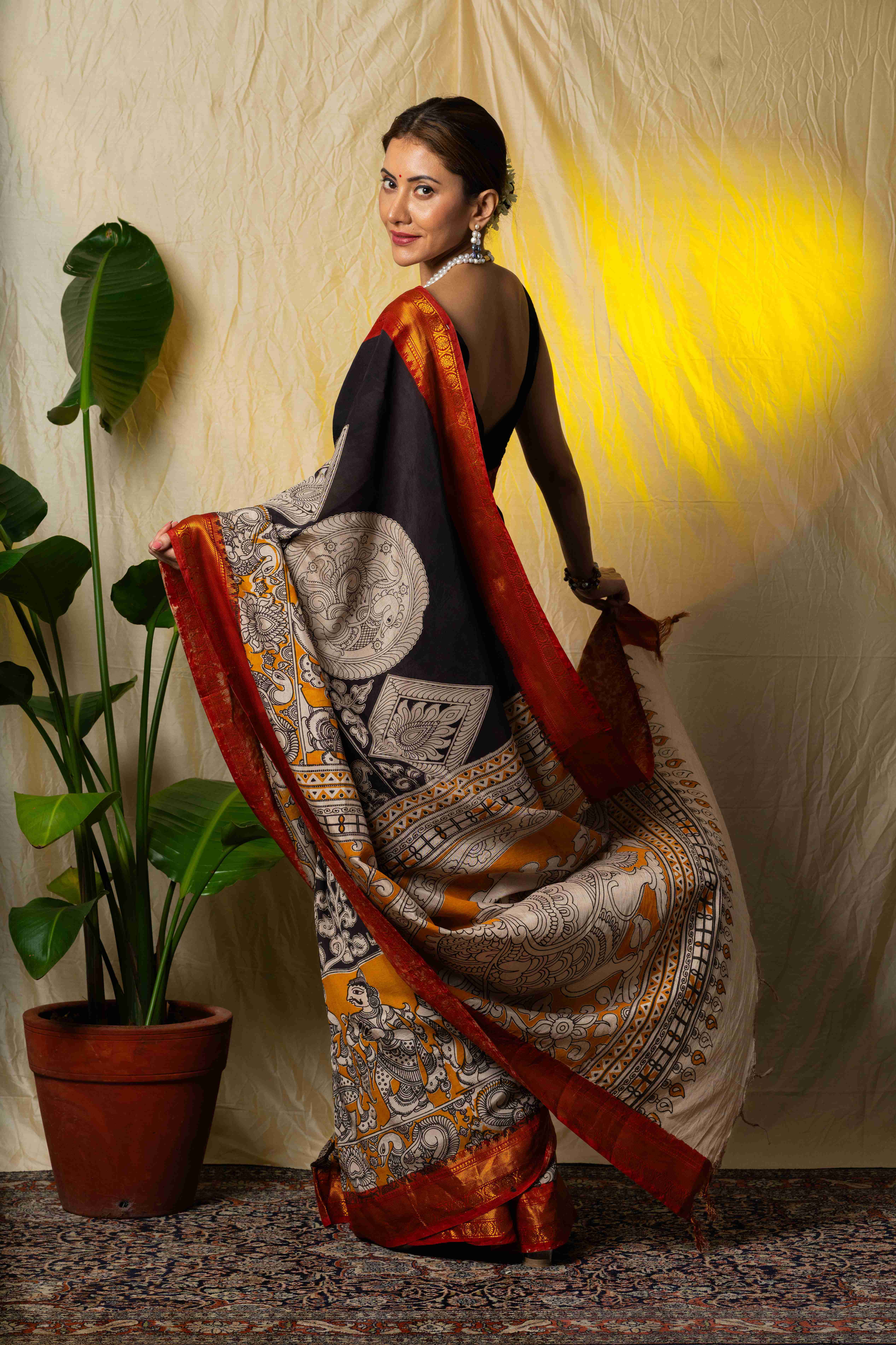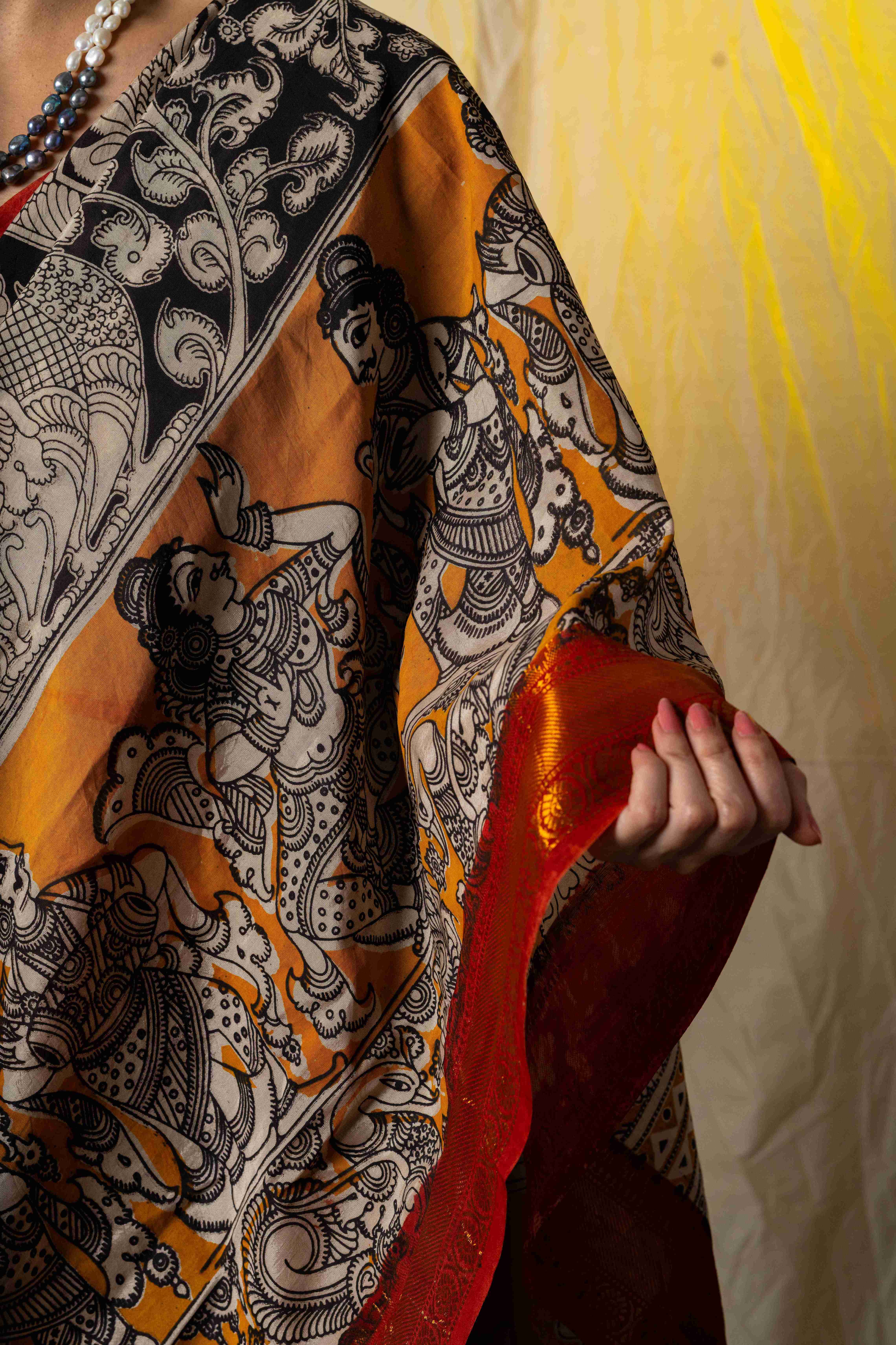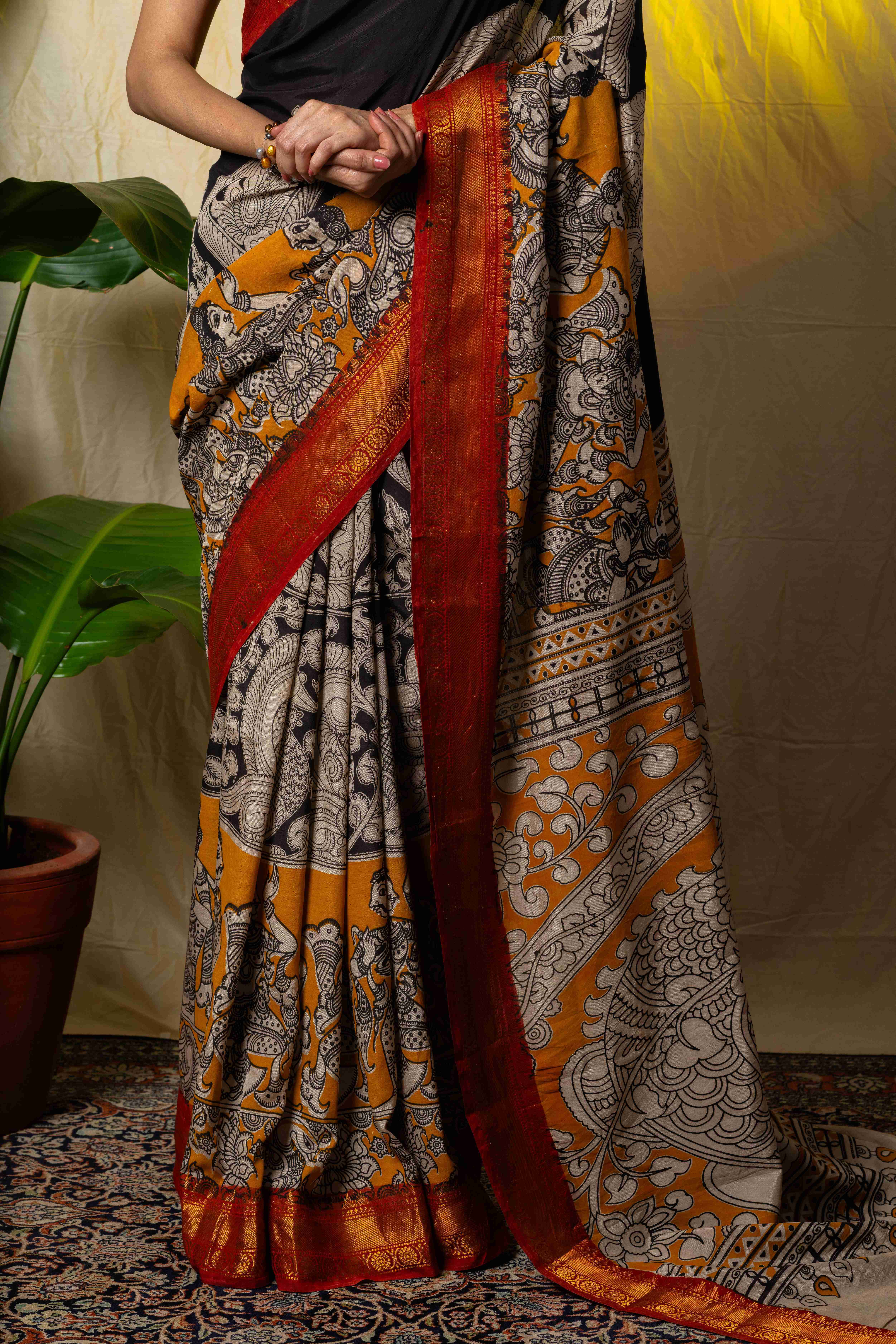 Grace meets craftsmanship in this exquisite Nellore silk saree, beautifully enhanced with traditional Kalamkari hand block prints. The rich sheen with intricate, hand-printed motifs inspired by heritage art. Lightweight yet luxurious, this saree is perfect for festive celebrations, cultural gatherings, and special occasions. A timeless piece that reflects elegance, tradition, and skilled artistry. Comes with a matching unstitched blouse piece.